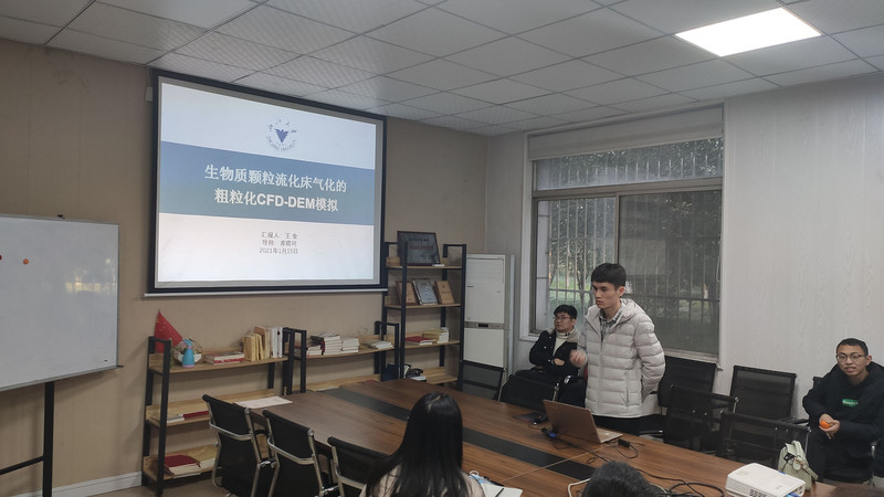 由王金同學(xué)帶來《生物質(zhì)顆粒流化床氣化行為的粗粒化CFD-DEM模擬》。基于計(jì)算流體力學(xué)(CFD)和粗粒化離散單元法(CG-DEM)對生物質(zhì)顆粒在流化床反應(yīng)器中的氣化過程進(jìn)行建模。通過構(gòu)建粗顆粒模型,實(shí)現(xiàn)了顆粒間的相互作用和熱傳導(dǎo);通過建立相間耦合機(jī)制,實(shí)現(xiàn)了粗顆粒與氣流間的體積競爭、動(dòng)量傳遞、熱質(zhì)交換和異相反應(yīng)。分別討論了生物質(zhì)在鼓泡流化床和循環(huán)流化床提升管中的熱化學(xué)轉(zhuǎn)化行為,定量分析了轉(zhuǎn)化過程中的床層鼓泡分布、顆粒磨損特性和氣固混合狀態(tài)。