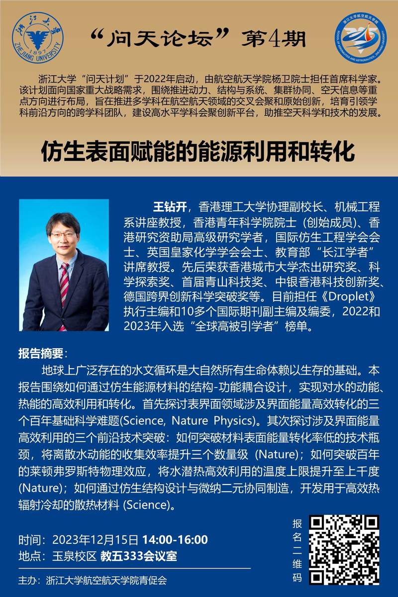 “問天論壇”第4期--香港理工大學王鉆開教授報告通知(2023.12.15 14:00-16:00)