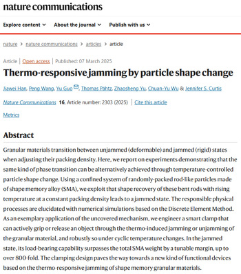 近日,浙江大學航空航天學院流體工程研究所研究人員在Nature Communications期刊上發(fā)表了題為《Thermo-responsive jamming by particle shape change》的研究成果。論文全文鏈接:https://doi.org/10.1038/s41467-025-57475-5。