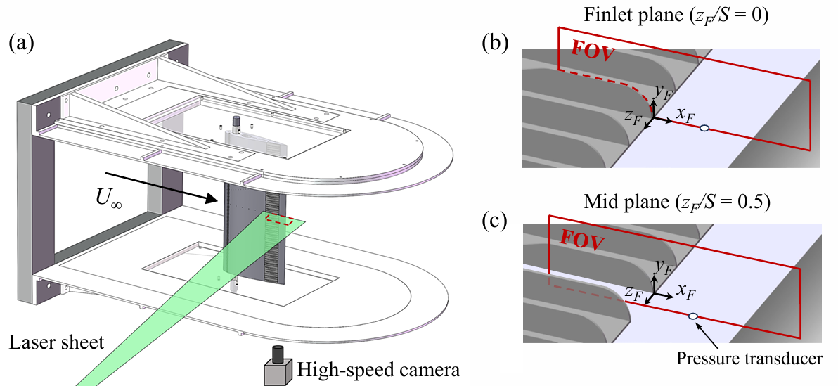 圖1. 時間解析PIV和壁面壓力脈動同步測量裝置示意圖,(a) 三維視圖,(b) 翅片平面,(c) 翅片間平面。
