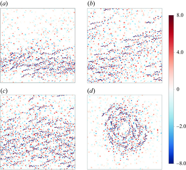 圖9. 穩定狀態下四種集群模態: (a) S0, 緊密群游狀態 (t/T=50); (b) S1, N=30個體稀疏群游狀態 (t/T=58); (c) S2, N=50個體稀疏群游狀態 (t/T=45); (d) M1, 渦旋運動狀態(t/T=50).注: 可在原文鏈接下載這些算例的補充視頻.