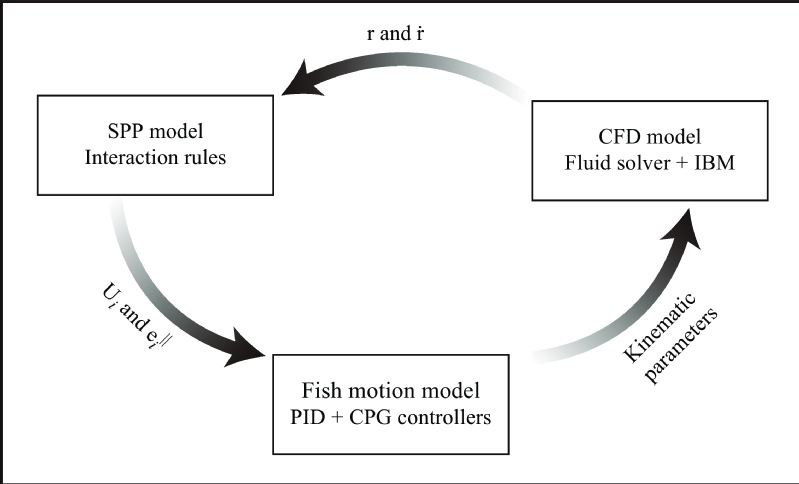 圖3.混合模型示意圖:通過中樞模式發生器(CPG)控制器,將自驅動粒子(SPP)模型與計算流體動力學(CFD)模型進行耦合.