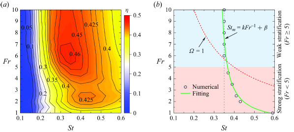 圖4. (a)拍翼推進(jìn)效率在參數(shù)空間(St, Fr)的分布云圖;(b)仿生拍動推進(jìn)在不同密度分層強度下的最佳斯特勞哈爾數(shù),散點表示數(shù)值模擬結(jié)果,實線表示理論擬合結(jié)果,研究表明最佳斯特勞哈爾數(shù)Stm與弗勞德數(shù)Fr成反比關(guān)系.