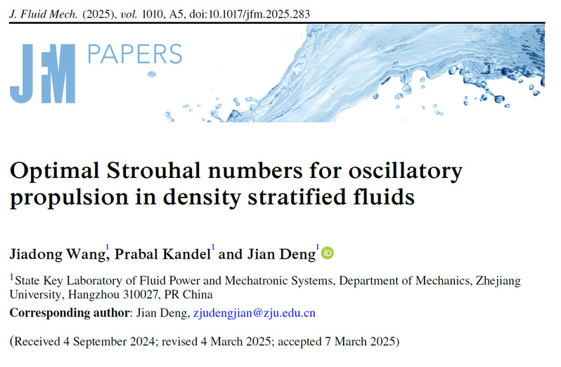 浙江大學(xué)鄧見教授團隊發(fā)表論文:仿生拍翼在密度分層流體中的最佳斯特勞哈爾數(shù)