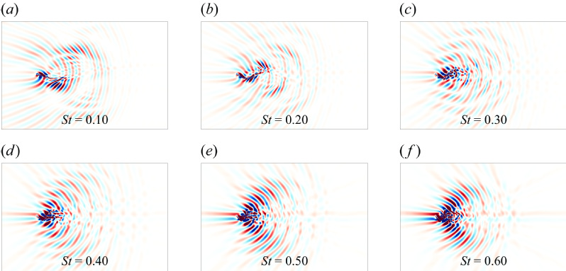 圖21. 仿生拍翼在強分層流動條件下誘導(dǎo)的渦量場:(a)-(f)對應(yīng)不同斯特勞哈爾數(shù)St.