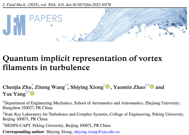 圖2:三維湍流中通過復標量場提取的渦絲結(jié)構(gòu)。 該研究以《Quantum implicit representation of vortex filaments in turbulence》為題,發(fā)表在流體力學領(lǐng)域頂級期刊 Journal of Fluid Mechanics。浙江大學航空航天學院本科生朱宸嘉與碩士生王紫騰為共同第一作者,熊詩穎研究員擔任通訊作者,北京大學工學院趙耀民研究員和楊越教授為論文共同作者。本研究工作得到了國家自然科學基金項目(編號:12302294、12432010、12525201)及國家重點研發(fā)計劃項目(編號:2023YFB4502600)的資助支持。同時,浙江大學本科生朱宸嘉獲得“啟真問學”創(chuàng)新平臺的資助與支持。 |
