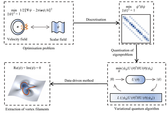 研究背景:螺旋纏繞的渦絲是湍流中普遍存在的典型現(xiàn)象,它不僅反映了流體內(nèi)部的非線性相互作用,也構(gòu)成了湍流結(jié)構(gòu)演化的核心。作為一種高度有序的結(jié)構(gòu)單元,渦絲在揭示湍流的動力學機制、重建流場以及提取統(tǒng)計規(guī)律等方面具有不可替代的重要意義。然而,傳統(tǒng)方法在模擬這類結(jié)構(gòu)時往往面臨精度與效率的雙重挑戰(zhàn),尤其在處理復雜拓撲關(guān)系時,計算負擔沉重,建模過程繁瑣。針對這一問題,本文提出了一種面向量子計算的新型建模思路:通過構(gòu)建復數(shù)標量場,將渦絲隱式表示為其實部與虛部的零等值面交線。這種方法不再依賴顯式追蹤渦線,而是借助標量場的演化統(tǒng)一描述流場中的幾何與拓撲特征,具有良好的可擴展性與表達能力。進一步,我們將該模型轉(zhuǎn)化為一個厄米矩陣的特征值問題,并借助變分量子特征值求解器進行優(yōu)化。在此基礎上,引入Pauli算符截斷與深度學習技術(shù),有效降低了噪聲干擾與計算資源消耗,實現(xiàn)了更高效的求解過程。該方法不僅顯著提升了建模效率與存儲能力,同時在精度、魯棒性和適應性方面表現(xiàn)穩(wěn)定,為復雜流場建模、渦旋動力學研究以及高質(zhì)量訓練數(shù)據(jù)的生成提供了全新的解決方案,也展示了量子計算在非線性流體問題中的廣闊應用前景。