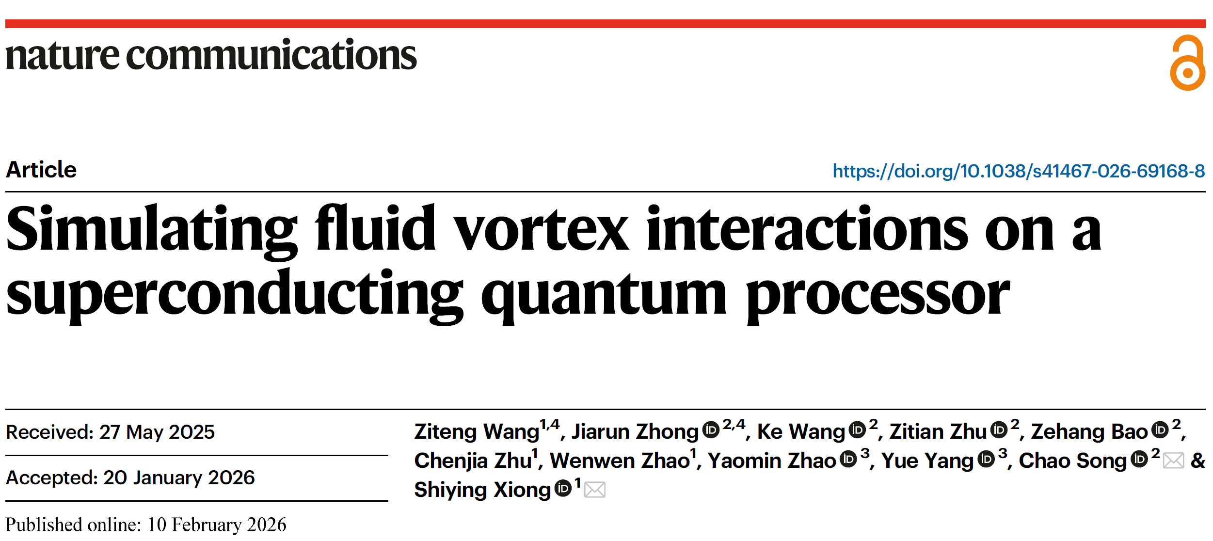 該研究以《Simulating fluid vortex interactions on a superconducting quantum processor》為題,發表在綜合性期刊 Nature Communications。浙江大學航空航天學院研究生王紫騰與浙江大學物理學院研究生鐘佳潤為共同第一作者,浙江大學航空航天學院熊詩穎研究員和浙江大學物理學院宋超研究員擔任共同通訊作者,研究的合作者還包括北京大學力學與工程科學學院趙耀民研究員和楊越教授等。本研究工作得到了國家重點研發計劃項目(編號:2023YFB4502600)及國家自然科學基金項目(編號:12302294,12432010,和12525201)的資助支持。